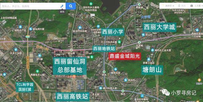 项目西侧为西丽留仙洞总部基地,东北侧为大学城,东侧为塘朗山,西南侧是西丽高铁站。