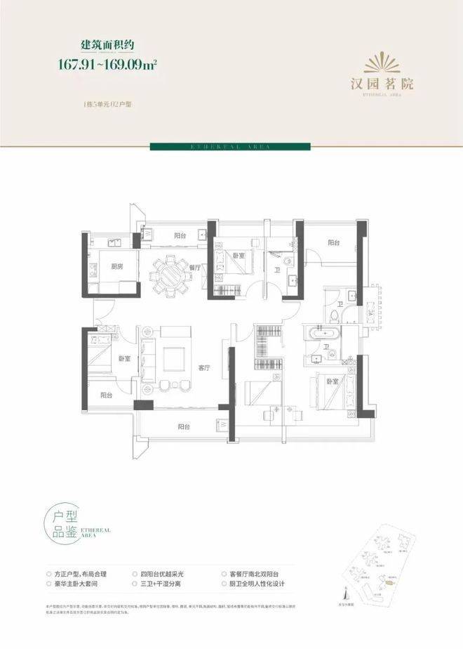该户型主卧非常阔绰,可以算得上是02户型加强版。面积段同样在167-169平米左右3房2厅3卫,其中2个卧室都自带卫生间,对于家庭成员年龄段跨度较大的家庭十分便利。该户型同时带有4个阳台,采光条件良好,通风条件较佳。