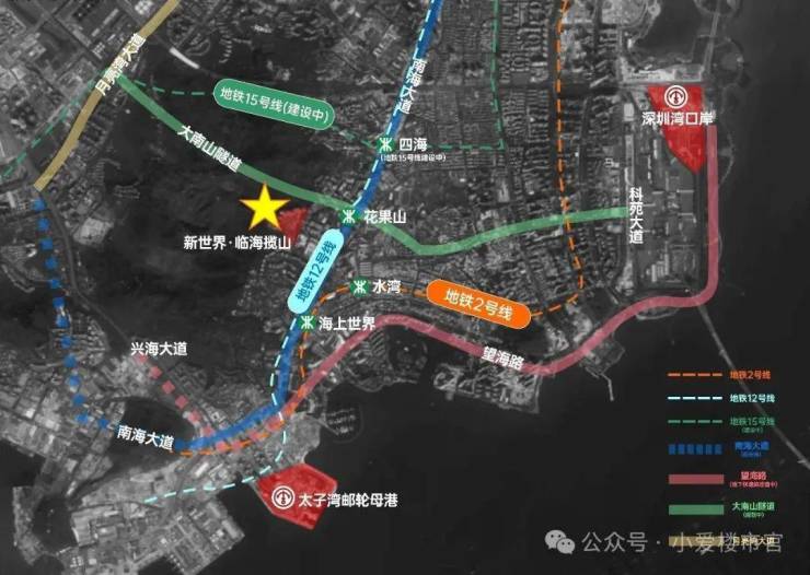 项目坐落于南山蛇口片区,背靠大南山,直面深圳湾海景,占据深圳湾超级总部基地与蛇口国际住区的黄金交汇点。交通方面,项目距离地铁2号线海上世界站约800米,未来与规划中的12号线南延段(预计2027年通车)无缝衔接,形成双地铁覆盖。