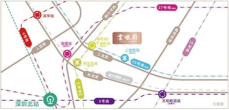 6地铁:22号线油松站(规划中)、25号线上油松站(规划中)、下油松站(规划中)、27号线油福站(规划中)于此汇聚,近邻五和站轻松换乘5号线、10号线,速达4号线龙华站,6地铁交汇,高效通达香蜜湖、前海等城市核心区域。
