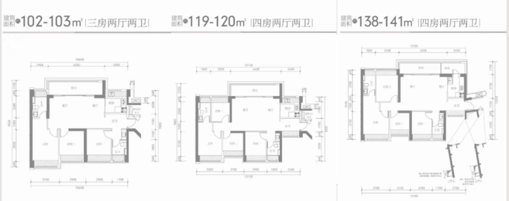 三个户型布局相似,120平相比102平多了一个卧室,139平相比120平多了一个生活阳台,随着面积增加,主卧开间从3.15-3.3-3.7米,总价也从489到567到704万,分别涨了78万和137万。
