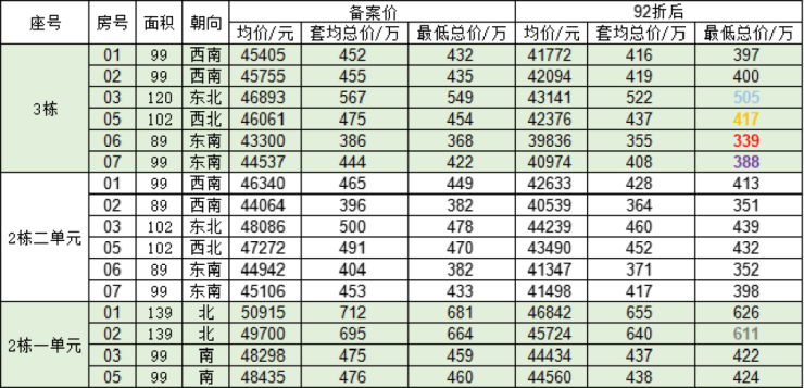 按照开盘92折计算,89平约339万起,99平约388万起,102平约417万起,120平约505万起,139平约611万起