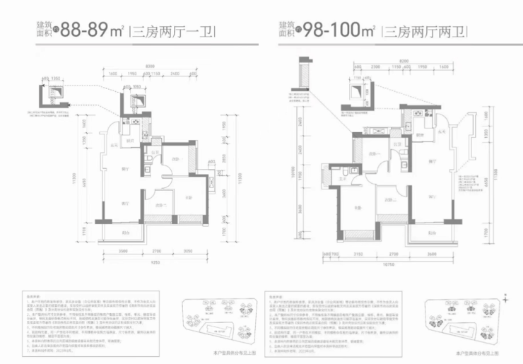 【产品户型】:建筑面积约85-88m²三房两卫、建筑面积约110-114m²四房两卫、建筑面积约113-119㎡四房两卫