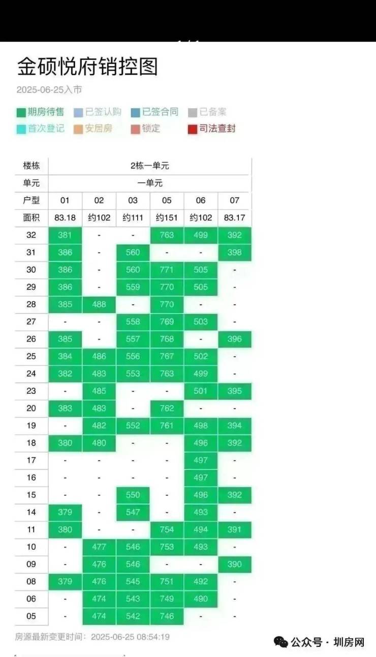 光明中心区,满京华金硕悦府计划将在2025年6月底取证入市,本次计划首推2栋1单元,共186套房源,面积有83-101㎡的3房2卫,111㎡的4房2卫,150㎡的5房2卫户型,价格方面可以参考前期开售的满京华金硕和府,备案均价4.72万/㎡,开盘会有折扣优惠,折后大概4.2-4.3万/㎡,起步门槛预计会在340万左右起。