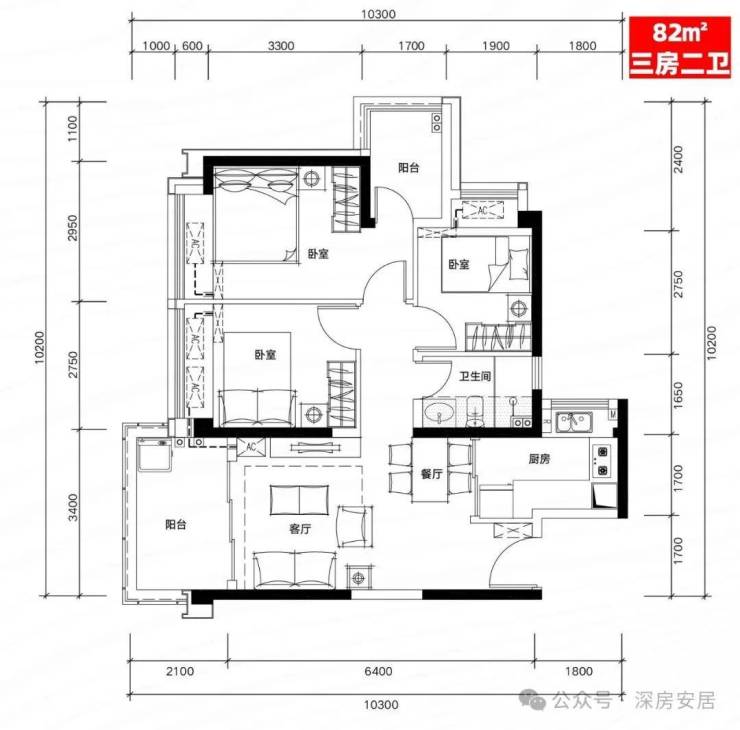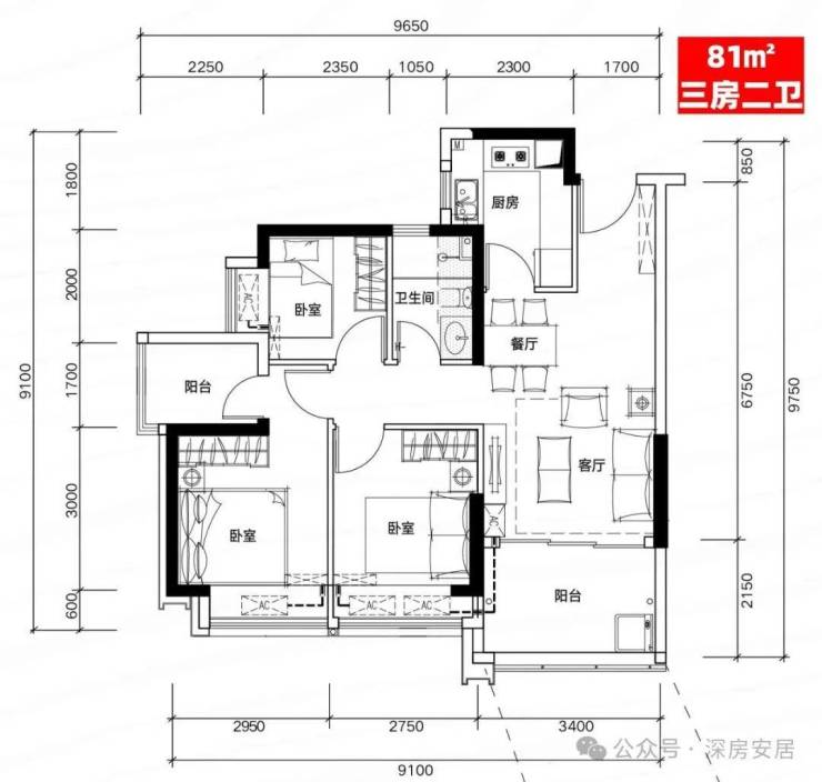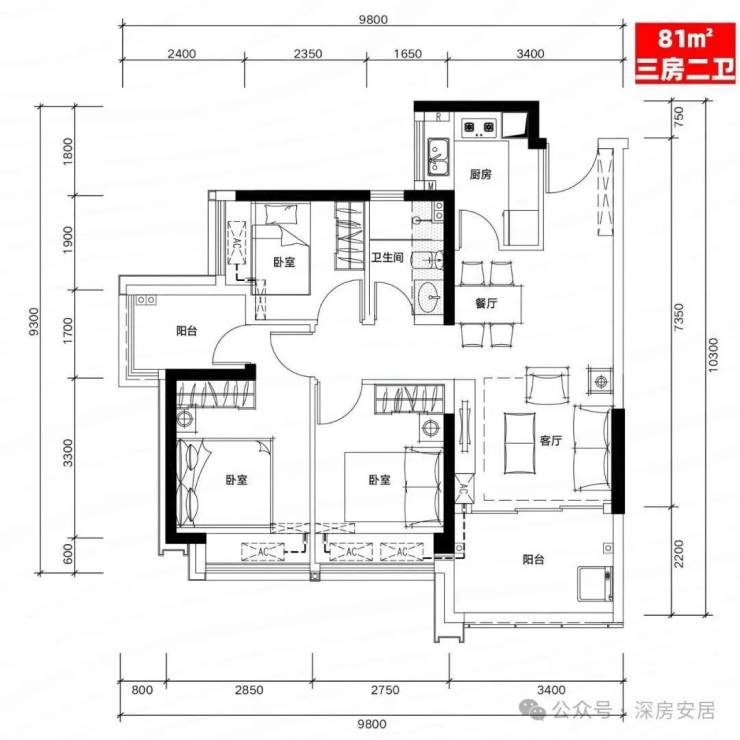 H03户型:81㎡三房二厅二卫