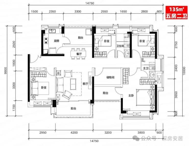 E户型:135㎡五房二厅二卫