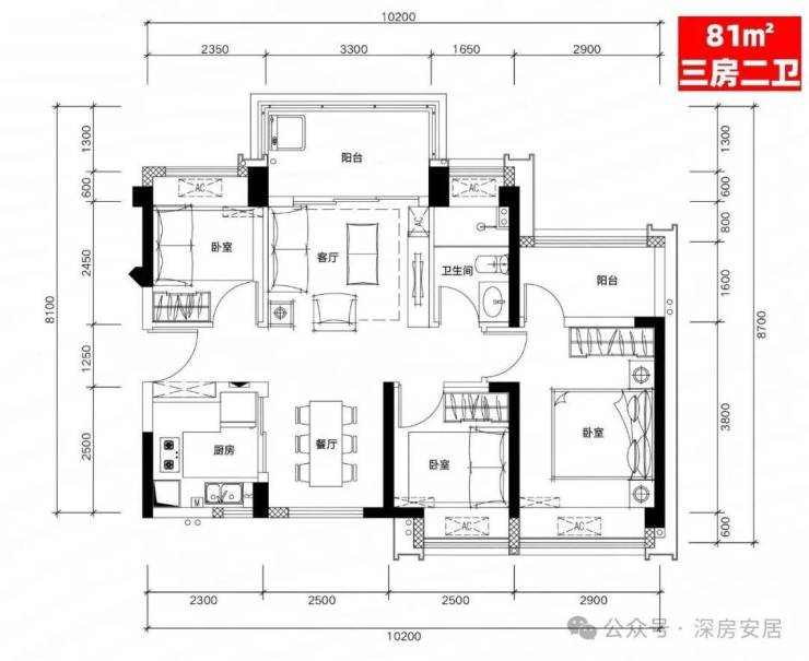 H02户型:81㎡三房二厅二卫