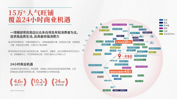 ◎5大稳定客群:周边社区、学府、总部集群、行政设施、前海运动公园等环绕,形成5大稳定消费客流,辐射周边直线距离约500m范围消费人群;(数据来源:百度地图,具体请以实际为准)