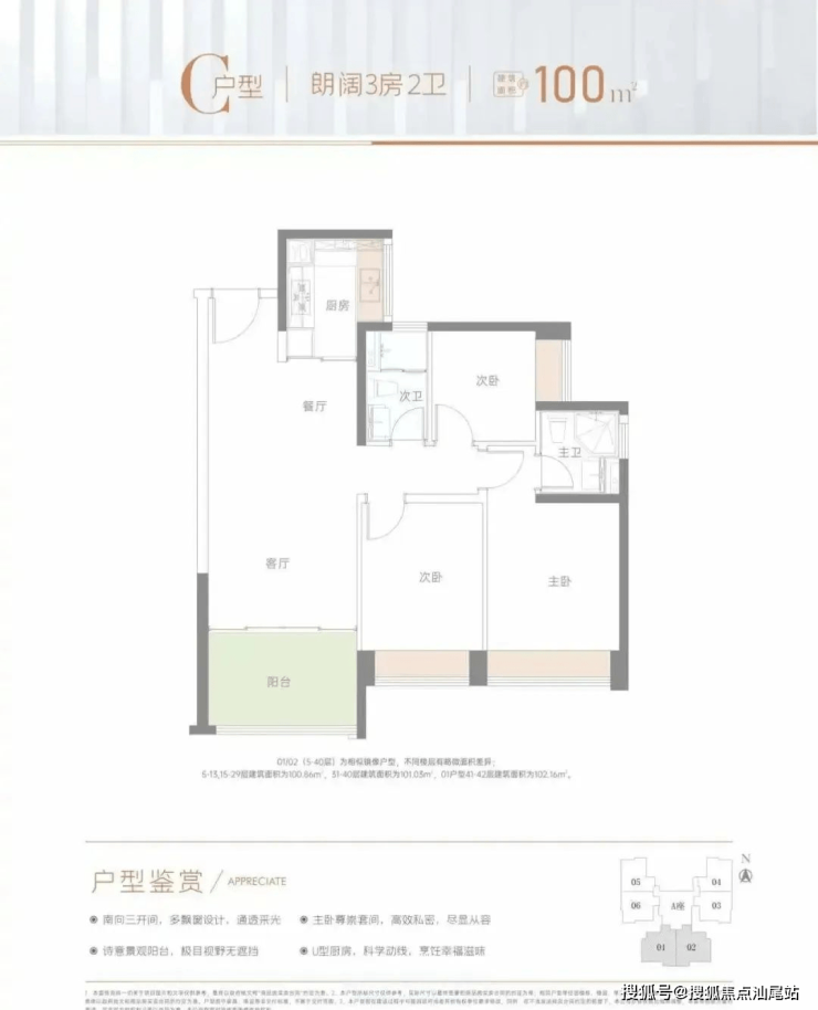 100㎡三房两卫:三开间朝南,主卧套房设计,适合改善家庭。