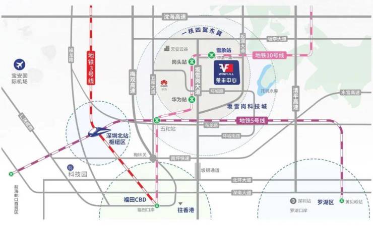 项目与10号线雪象站(E出口)0距离对接,连接了福田、龙华和龙岗三区,紧密联系起坂田、平湖与福田中心区,促进这三大区域的产业发展。通过深圳发达的地铁网络,与地铁3号线、5号线、9号线及多条规划地铁线路无缝链接,在未来的产业发展和通勤效率上,将摆脱交通因素的制约,实现东西南北全贯通模式。