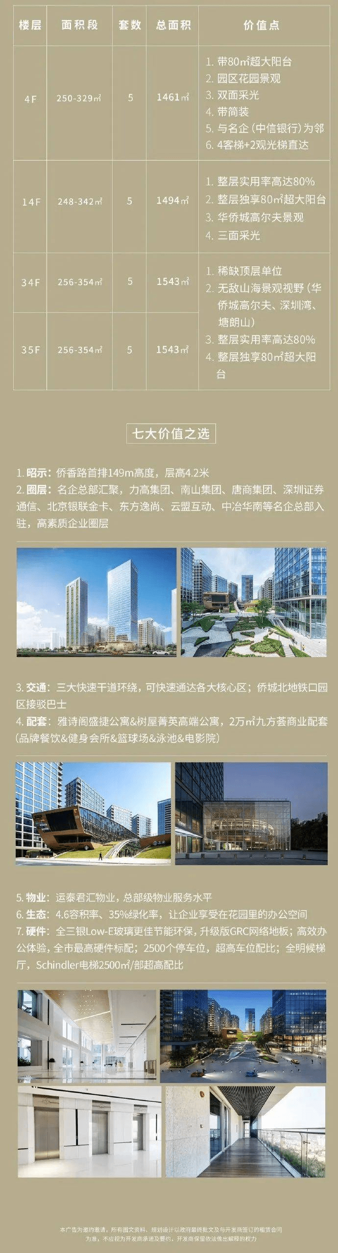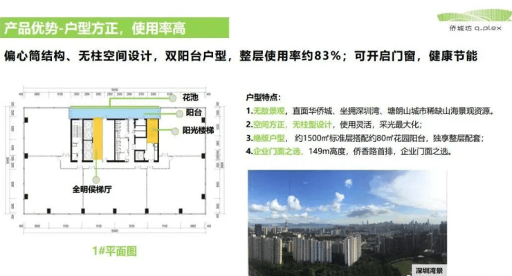 【侨城坊1号楼】深圳华侨城写字楼租赁;侨城坊1号楼,开发商现楼直租,整层约80%实用率,单套71%实用率;侨香路首排149m高度,绝版户型&每层配约80平米花园阳台,接驳巴士,雅诗阁公寓,九方商业,健身会所,篮球场,泳池等配套。