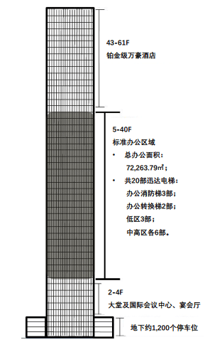 B座34层,高端商务写字楼,高约158米;A座办公楼面积共约6.8万平米,B座办公面积约为4.4万平米;五星级万豪酒店位于A座43-61层,约341间豪华套房,其中大部分为一线海景客房。