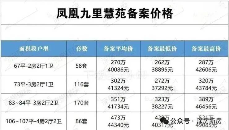 龙岗平湖,金光华凤凰九里慧苑于2023年11月23日取证入市,本次首推1栋1/3单元,共430套房源,面积68㎡的2房1卫,83-85㎡的3房2卫,106㎡的4房2卫户型,备案均价4.21万/㎡,备案单价3.72-4.9万/㎡,总价263-522万/套!计划在2026年3月带精装交付。