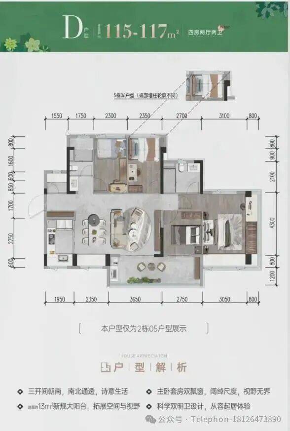 05户型117㎡4房2卫:均价5.22万,总价区间552-629万。