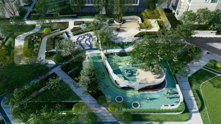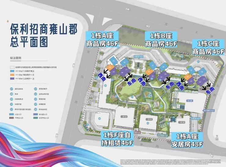 保利招商雍山郡,由保利+招商集团2大央企开发,总占地面积约2.5万㎡,总建筑面积约18.3万㎡,计容建筑面积约13.5万㎡,容积率5.4,绿化率35%,共由5栋46-48F的超高层住宅组成,其中1栋A/B/C座商品房46F,1栋D座安居房48F,1栋全年自持租赁住房46F,2栋是1所幼儿园。