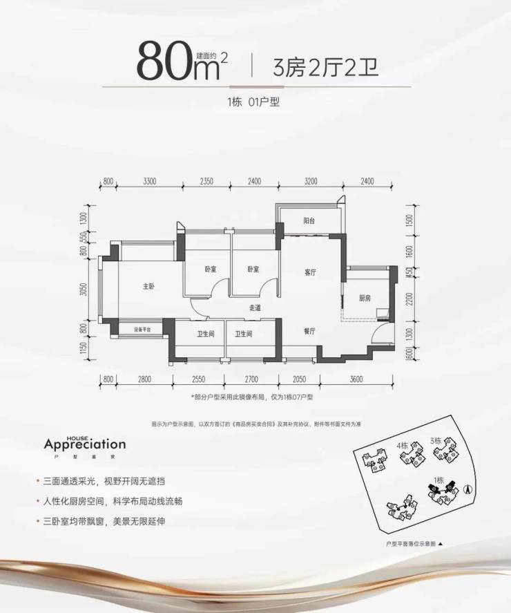 80㎡是本批次产品中唯一设计为南北对流格局,而且是整体横向采光,位于1栋,仅有2条腿,朝向社区内部园林相对静谧。