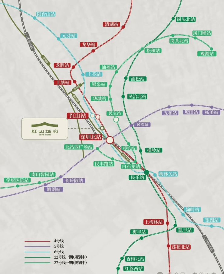 4/6号线红山站,1站直达深圳北站,换乘 5 号线可以快速达到南山、前海、宝中
