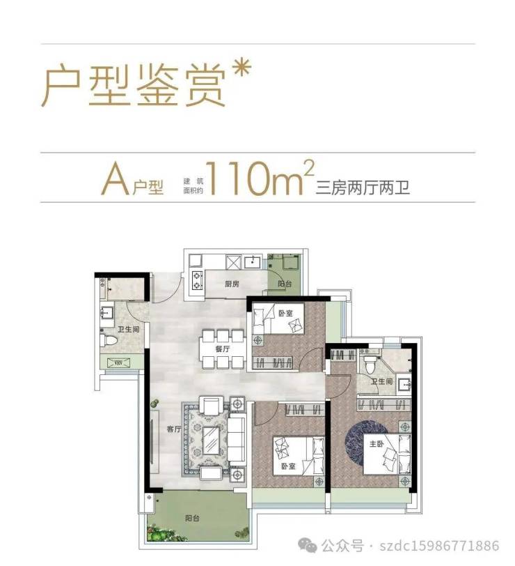 主力户型为建面约90/110㎡的A/B户型,全系采用全尺寸飘窗/转角飘窗和大阳台配置,充分发挥景观优势。