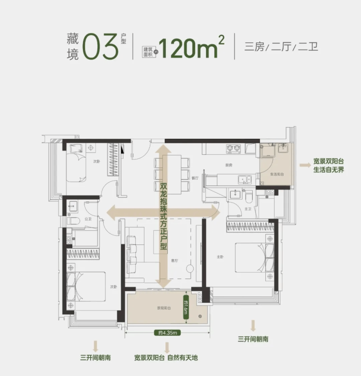 约120㎡3房2卫:双龙抱珠户型,三开间朝南,双阳台设计。