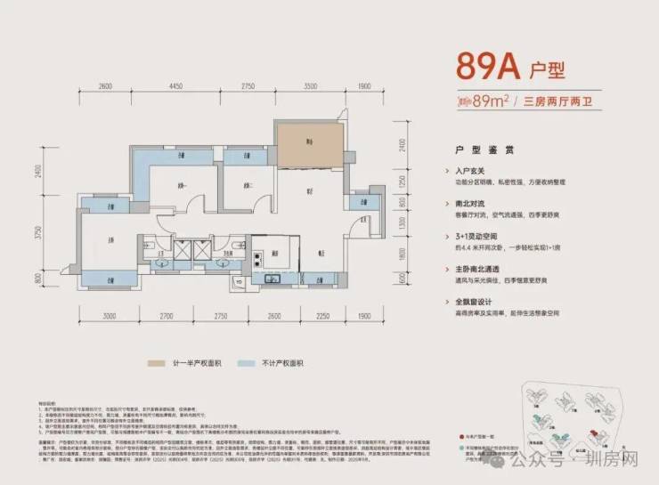 入户处比较宽敞,可以做鞋柜收纳,客餐厅南北对流,全飘窗设计,高得房率及使用率,主卧南北通透,通风和采光不错,套房设计,其中一个次卧可以改成1+1房。