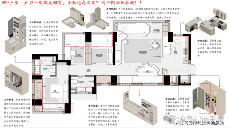 这里89E户型据了解可以改为3+1房四房,但是虽然说是改四房但是是牺牲了餐厅改为房间,他把餐厅放到了飘窗位但是有点拥挤,或者可以学润宏城一期把餐厅放到厨房一体化,当然如果不改四房单纯做三房两卫,这个户型还是挺能打的,整体空间都挺大,而且还是双面采光。