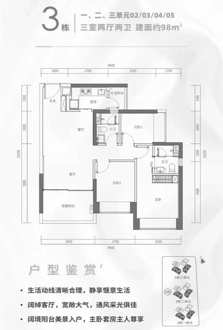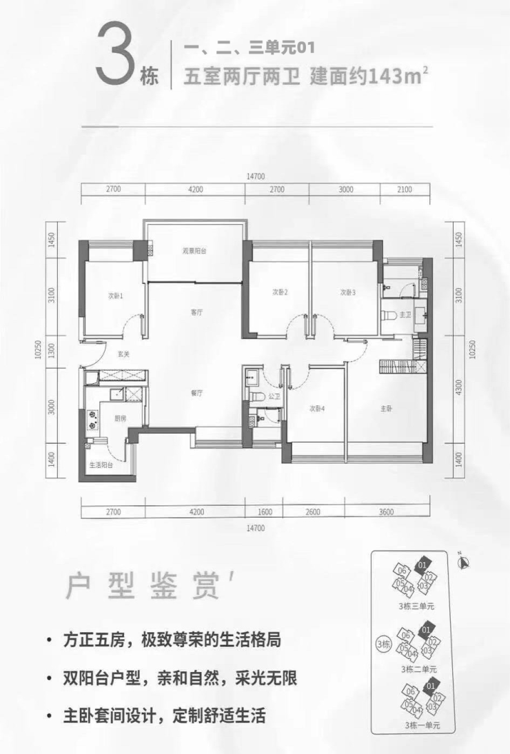 约98-121-143平3-5房,户内层高3米,采用一线高端品牌精装交付,即买即入住;3梯6户高效出行,高品质生活保障。