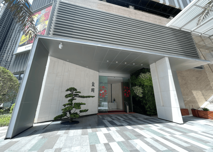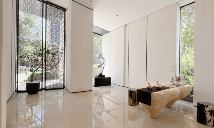 立面主要采用为石材、大铝板与玻璃、真石漆,这种组合搭配常见于南山、福田豪宅项目使用,历久弥新。园林设计师是日本户田芳树,布置有罗汉松、小叶紫檀等名贵树种。