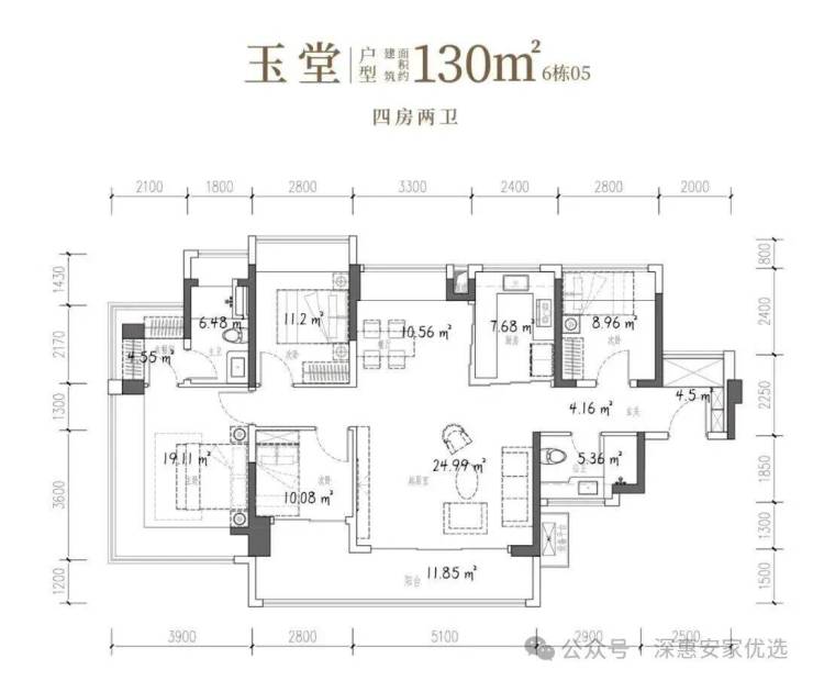 130㎡的4房2厅2卫,设计的是竖厅南北通透格局,进门独立玄关,客厅5.1米开间,客餐厅分离化设计,主卧270°无柱转角飘窗+衣帽间,分别做到了主卧23.66㎡/次卧11.2㎡/次卧8.96㎡/次卧7.84㎡(包含墙体飘窗),U型厨房烟道外置,卫生间干湿分离,得房率约101.95%(包含赠送),客厅连接次卧出超大阳台约14.09平,东北朝向。