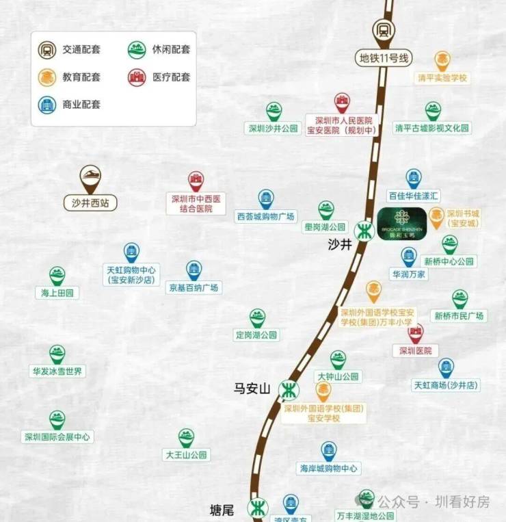 项目距离地铁11号线沙井站约400-550米,步行可达,周边还有宝安大道、广深公路、深圳外环高速等交通要道,自驾出行便捷。对于需要频繁往返南山、福田等核心区域的购房者,交通便利性是一个重要优势