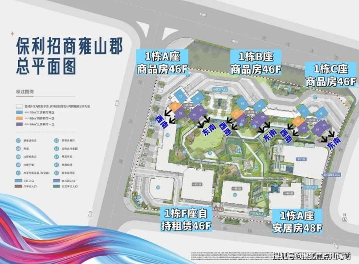 保利招商雍山郡,由保利+招商集团2大央企开发,总占地面积约2.5万㎡,总建筑面积约18.3万㎡,计容建筑面积约13.5万㎡,容积率5.4,绿化率35%,共由5栋46-48F的超高层住宅组成,其中1栋A/B/C座商品房46F,1栋D座安居房48F,1栋全年自持租赁住房46F,2栋是1所幼儿园。
