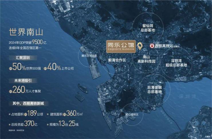 项目雄踞深圳经济主引擎腹地——南山科技园之上,5大全球总部基地核“芯”居住区,西丽高铁新城枢纽发展辐射,共享湾区繁荣。