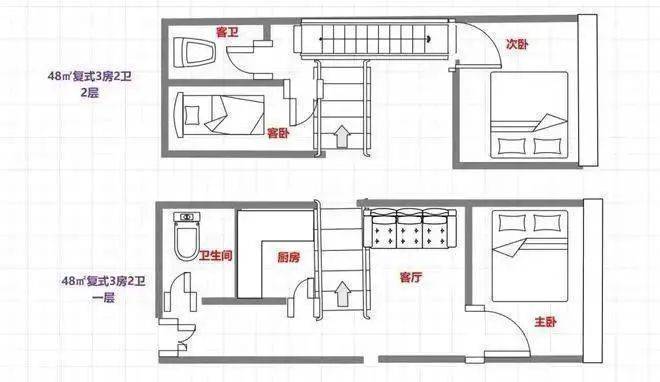48㎡㎡3房2卫