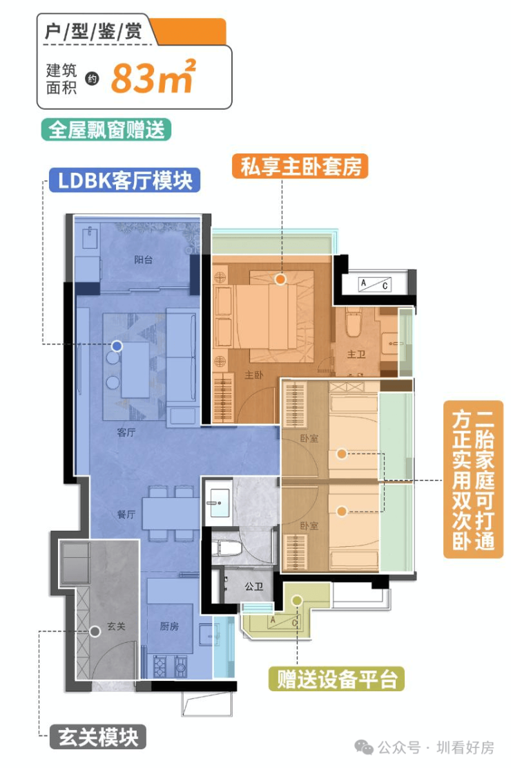 在寸土寸金的龙华,80㎡左右的户型多是“勉强够用”的3房1卫,而卓越珺奕府约83㎡直接做到3房2卫,还是区域内少有的小面积3房2卫——首置家庭一步到位享受改善盘的舒适感,每一寸空间都用在刀刃上,居住需求不“委屈”。
