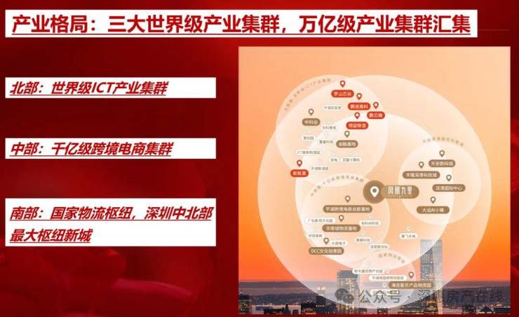 1、楼盘所在位置是深圳发展的中轴,有万亿级ICT产业集群和千亿级跨境电商等产业提供就业机会;