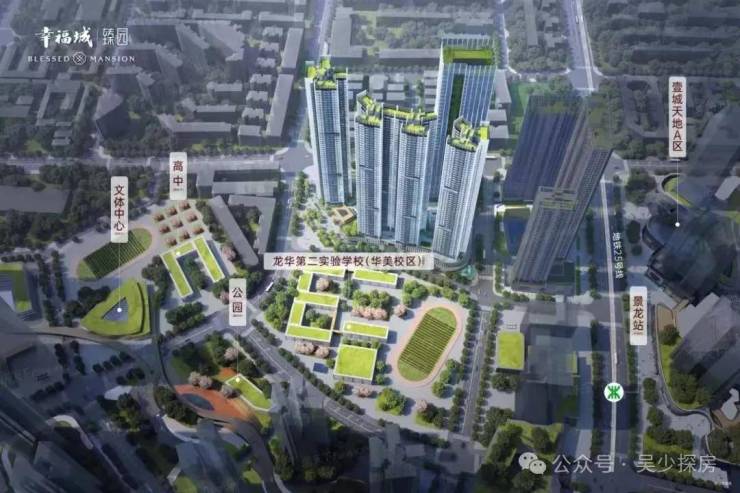 幸福城臻园一路之隔就是壹城中心商业MALL,4/25号线龙华站距离仅400米,未来楼盘200米内也有规划两所九年制公办学校,总高都是41-56层的超高层住宅。