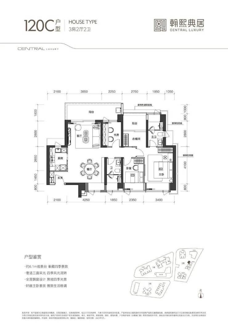 120㎡C户型:位于三单元01梯腿,3+1房2卫,朝北向,这一个户型衣帽间+阳台也可改+1房,而且改造后独立性与私密性比120㎡B户型要好,与主卧完全区隔。