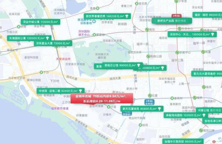 与此同时,项目整体定价在福田核心区同类产品中优势明显,福田核心区基本均价10万+/㎡。而金地环湾城在规模更大、配套更完善的情况下,价格优势明显。