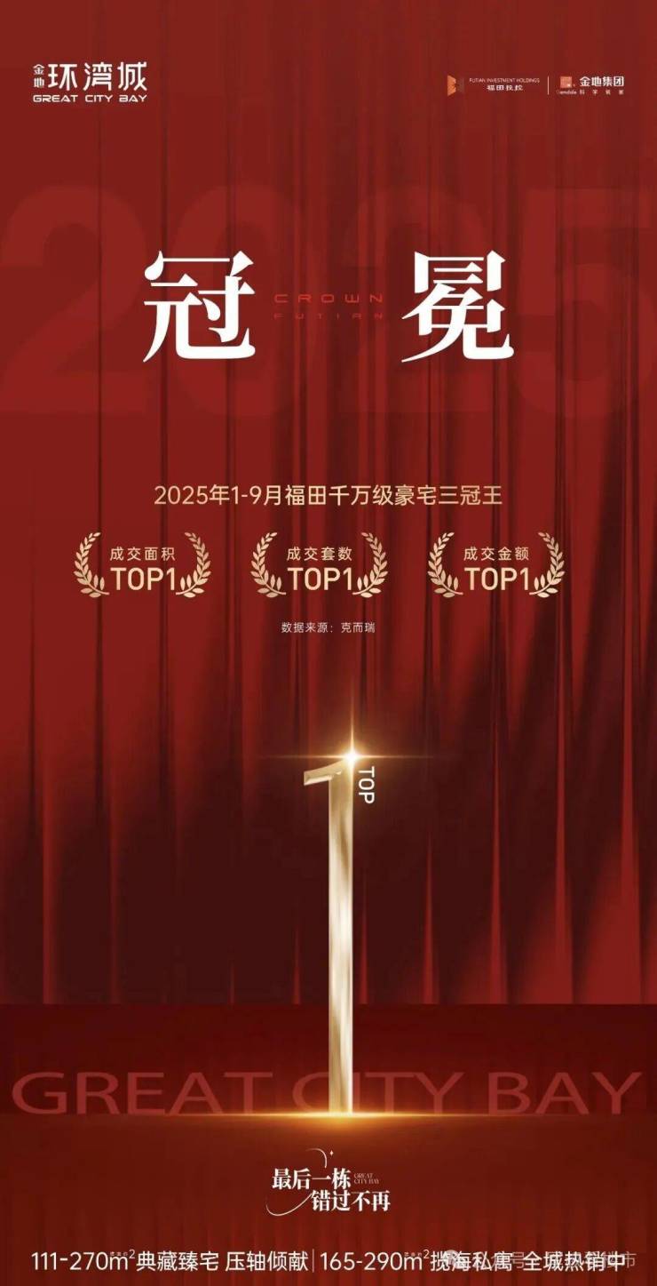 金地环湾城取得2025年1-9月福田千万级豪宅成交套数、面积、金额三冠王。项目的热销并非阶段性脉冲,而是持续领跑市场。