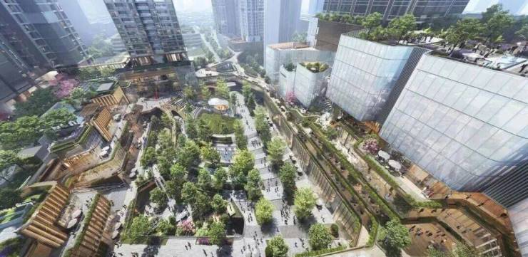 公园式的商业休闲: 项目规划约 13 万㎡商业空间,由国际设计团队LEAD8(深圳湾万象城设计方)与日本Pinhole联合打造, 包含新加坡风格私家花园、41层空中生态庭院等, 构建自然与商业共生的漫调生活场域。