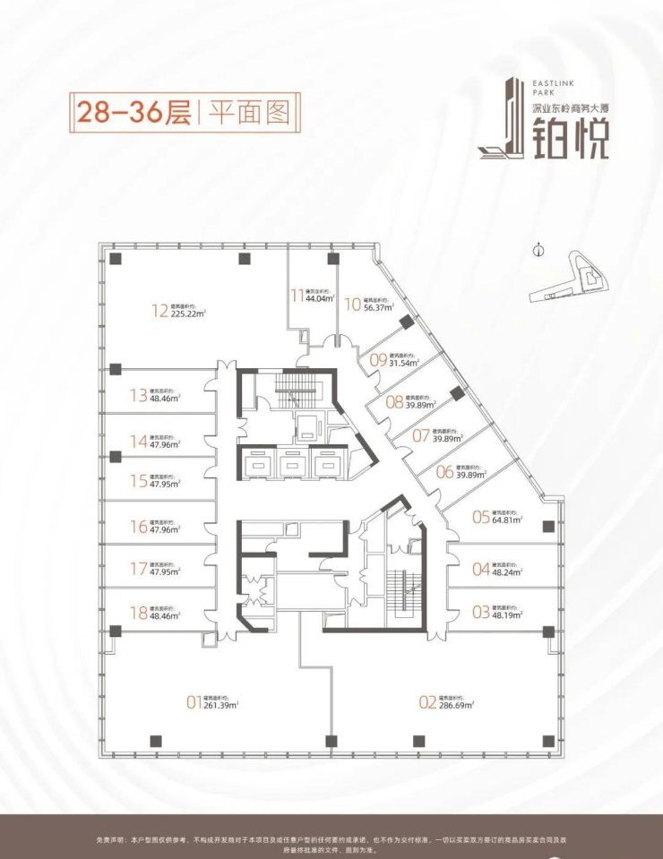 塔楼办公:位于17-36层,整体面积约27767.36㎡,单层面积约1460㎡