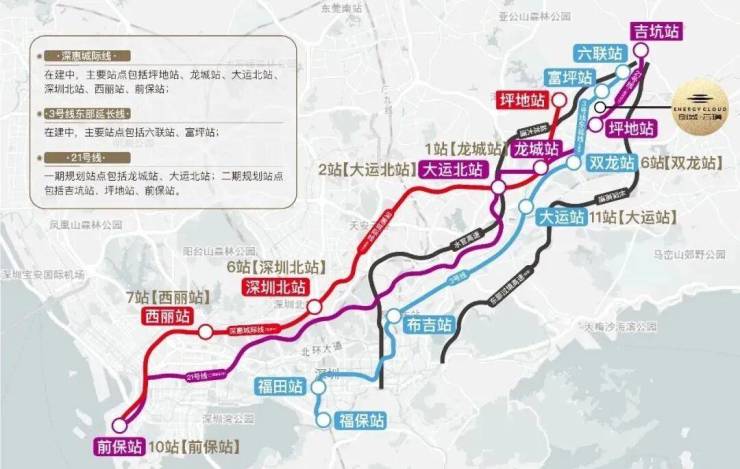交通配套:创城云璞交通配套极为完善,地铁3号线东延线富坪站已开通,距离项目仅约200-300米,步行10分钟可达。乘坐3号线到大运站可便捷换乘14号线,30分钟直达福田中心区。深惠城际轨道线坪地站预计2026年11月开通,时速160公里,1站到龙城、2站大运北、6站到深圳北、7站到西丽、10站速达前海,实现"1小时湾区生活圈"。