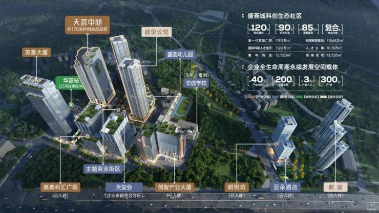 🔹超大体量产城综合体 —— 盛荟城总建面约85万㎡,含40万㎡产业空间(已投用20万㎡)、集高端住宅、甲级写字楼、商业配套等多元业态于一体。