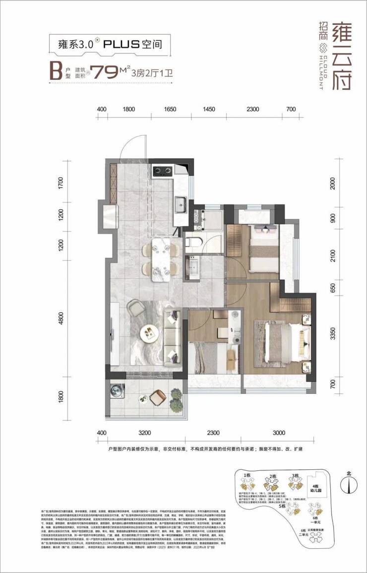 招商雍云府,占地面积约2.7万㎡,总建筑面积约13.36万㎡,计容建筑面积9.76万㎡,容积率3.5,共由6栋22-31F住宅组成,其中1栋商品房31F,2/3/5栋商品房30F,6栋1单元商品房29F,6栋2单元公共租赁住房22F,4栋是1所9班制幼儿园。