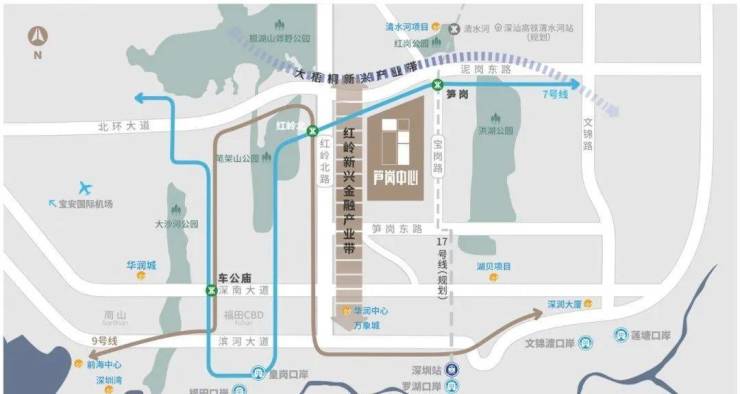 三线地铁:7号线、17号线(规划中)双地铁站上盖,于笋岗站双线换乘,距离9号线红岭北站约600米,3-5站即可到达华强北、万象城、人民南等商圈。
