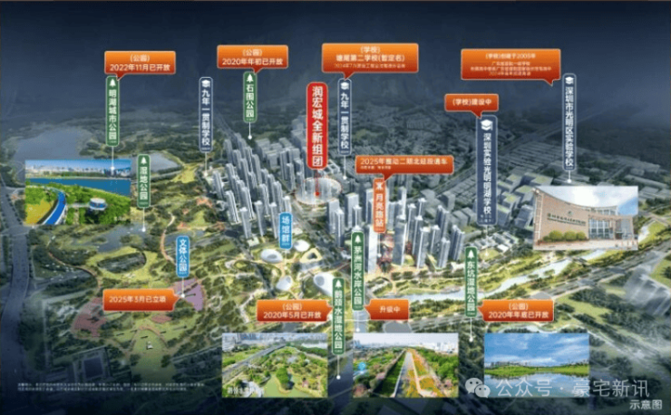 华润润宏城,位于光明区凤凰街道塘尾社区,总占地面积约195万㎡ ,总建筑面积约382万㎡,住宅面积高达172.44万㎡,分多期多地块开发,其中一期就分4个地块开发,前期入市的是润雅园已经基本售罄,还剩少量4房在售,这次润臻园就是1期其中一个地块,后面还有二期三期,另外产业配套也分4期开发打造,还规划有3所九年制学校、2所18班幼儿园,3所12班幼儿园,3所9班幼儿园。