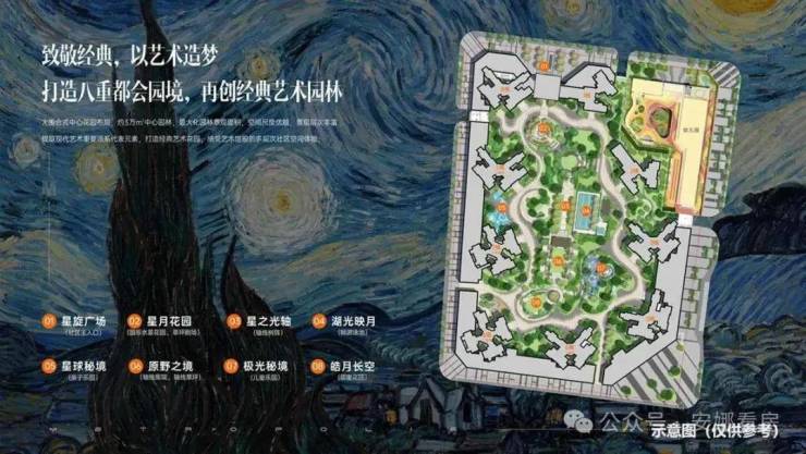1 区是星空花园主题园林,约 3 万㎡的园林景观,相当于约 4.2 个标准足球场大小,配备全龄泳池和两大儿童主题空间,以梵高《星月夜》为灵感打造 “八重都会园境”。2 区是舒居艺术大园林,约 2.8 万㎡园林景观,最大楼间距约 187 米,同样有全龄泳池、亲子乐园和交流花园,其源于莫奈《睡莲》灵感的艺术主题花园,让业主仿佛置身梦幻仙境。