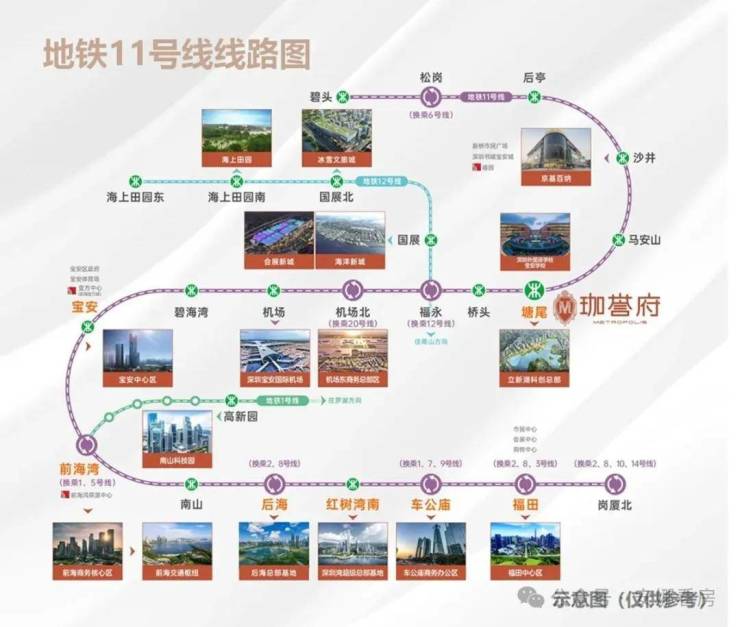 家门口就是地铁 11 号线塘尾站,乘坐地铁 6 站可到宝中,7 站到前海,9 站到后海,11 站到车公庙,轻松畅达南山、福田核心片区,真正实现了都市便捷生活。
