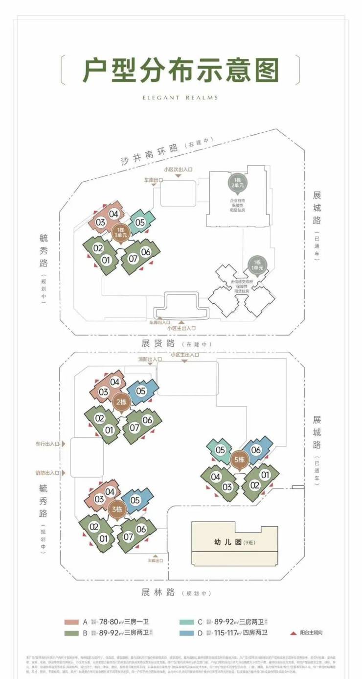 2、3、5栋为纯住宅,总高31-32层,4栋为1所4层2970㎡幼儿园,容积率4.3。