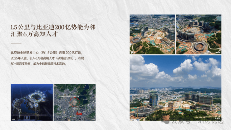 比亚迪全球研发中心(约1.5公里)斤资200亿打造)2025年入驻,引入6万名高端人才(硕博超50%)。布局50+前沿实验室,成为全球新能源技术高地