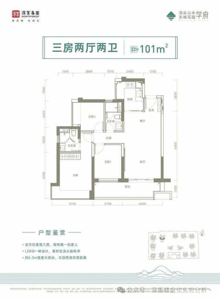 101㎡的3房2厅2卫,设计的是经典竖厅格局,进门入户玄关,客厅3.6米开间,LDKB一体化设计,三开间朝南,3个卧室分别做到了3.75米/2.7米/2.42米的宽度,客厅连接次卧出6.3米的大阳台,U型厨房,卫生间干湿分离,得房率:75%(不含赠送),西南或东南朝向。